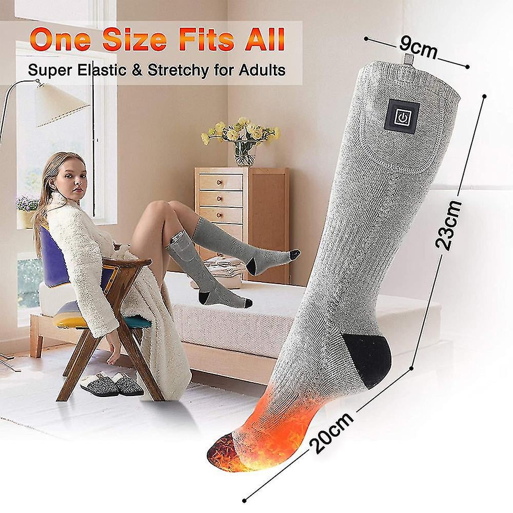 Our heated socks are battery-powered and run on two impressive rechargeable 3.7V 6000mAh lithium polymer batteries, they can heat up to 10 hours after a full charge at the lowest temperature setting (104°F-119°F). There is a small pocket on the side of each sock to store the battery.