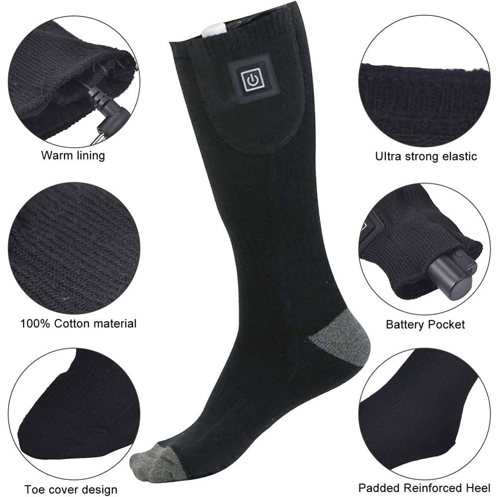Our heated socks are made from comfortable material: 80% cotton, 12% polyester fiber, and 8% spandex, with padded reinforced heel and toe, designed with a recessed heating element that helps focus the heat in the toe to keep your feet warm and cozy. Perfect for skiing, hiking, hunting, ice fishing, and all other indoor/outdoor activities in cold weather.