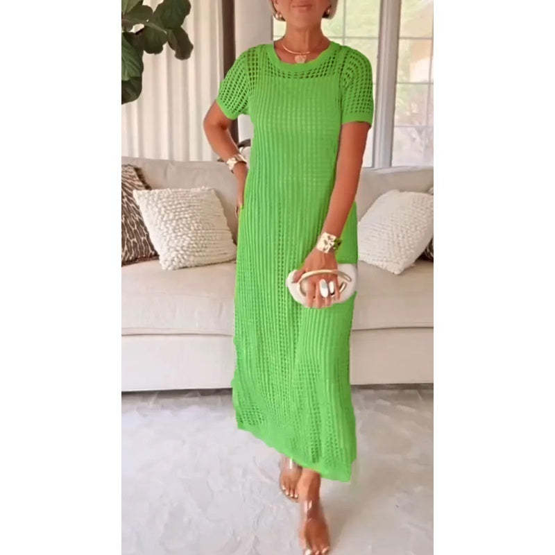 HOLLOW-OUT OUTER DRESS – Light, Airy, and Stylishly Detailed: The hollow-out short-sleeved smock dress features a relaxed cut with an eye-catching design. It’s loose enough to stay cool, yet structured to hold shape. The delicate cut-outs offer a breezy feel and a layered aesthetic, turning this casual maxi dress set into an effortlessly fashionable statement suitable for everyday wear or summer outings.