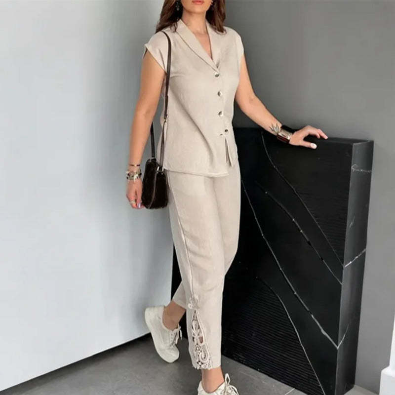 FEMININE CROPPED PANTS WITH DELICATE DETAILS - Complementing the top is a pair of chic cropped pants, detailed with delicate lace trim along the hemline for a soft, feminine finish. The adjustable elastic waistband with drawstring ensures a comfortable, personalized fit that flatters all body types.