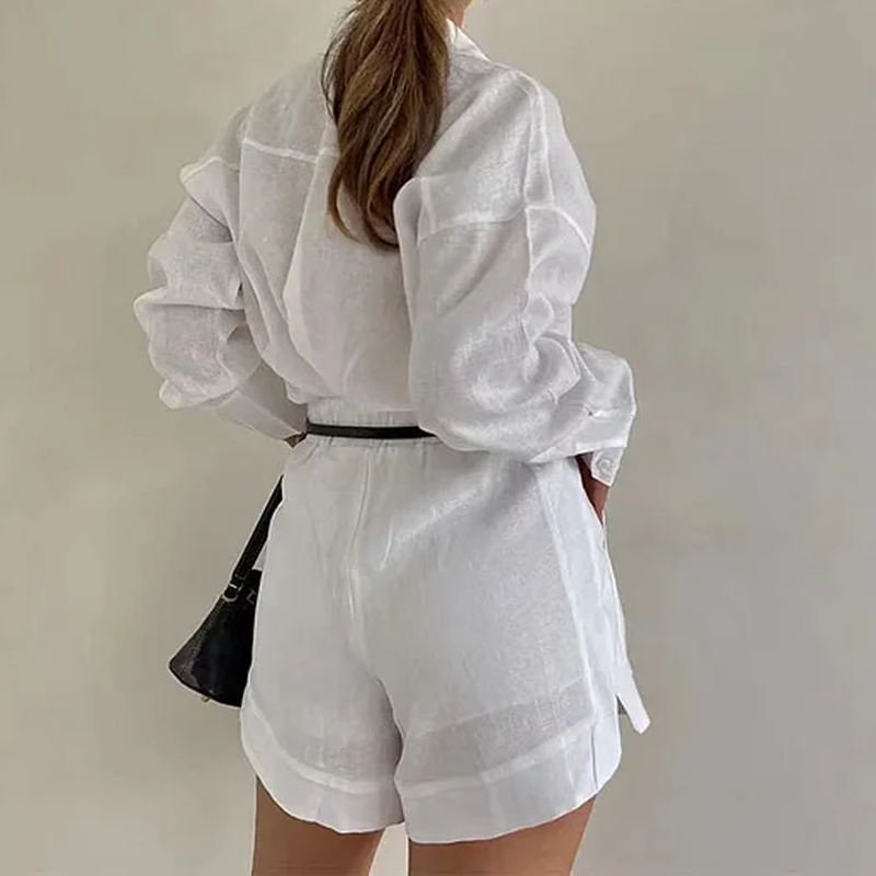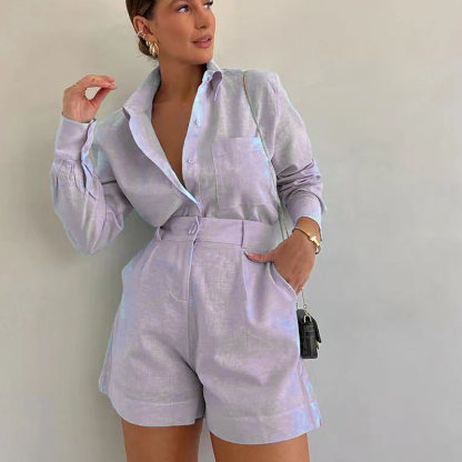 ELEGANT TWO-PIECE SET – This stylish ensemble includes a long sleeve shirt and shorts designed for a coordinated, fashion-forward look that seamlessly transitions from daywear to evening elegance.